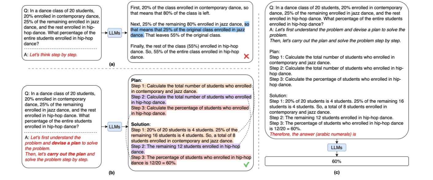 Plan formulation- The LLM is instructed to analyze the problem and create a plan, breaking it down into smaller, more manageable subtasks. Here the phrase “Let’s first understand the problem and devise a plan to solve the problem. Then, let’s carry out the plan and solve the problem step by step” is added to the original prompt.Plan execution- With the plan established, the LLM works through each subtask in sequence, performing necessary calculations, applying appropriate reasoning, and reaching the final solution.